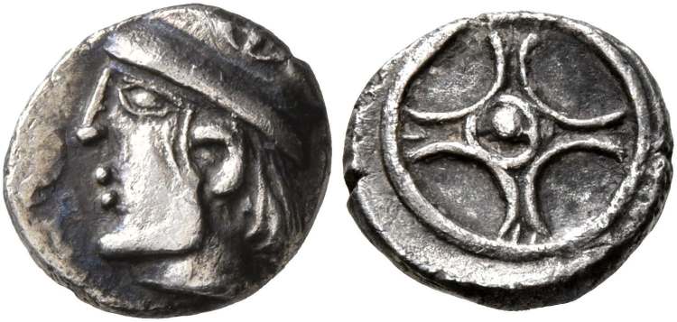 | Depeyrot 2 | Massalia. AR obol, ca 450-400 BC. 10 mm, 0.9 g. Helmeted male head right with wheel on helmet. / Wheel of four spokes. Depeyrot 2. | Text | Image |