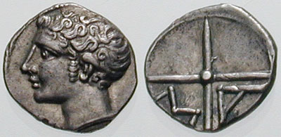 | DLT 520 | Massalia. AR obol, ca 475-386 BC. 10 mm, 0.9 g. Helmeted male head right with wheel on helmet. / Wheel of four spokes. LaTour 520. | Text | Image |