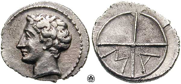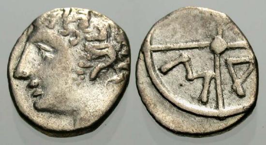 | DLT 699 | AR Obol of Massalia, Gaul. Youthful head of Apollo or river god left / M A in two sections of wheel of four spokes. | Text | Image |