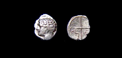 | DLT 95 | Massalia, Gaul, AR tritemorion. c. 475-460 BC, Archaic helmeted female head right / Four part incuse. LaTout 95.