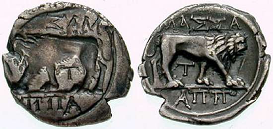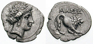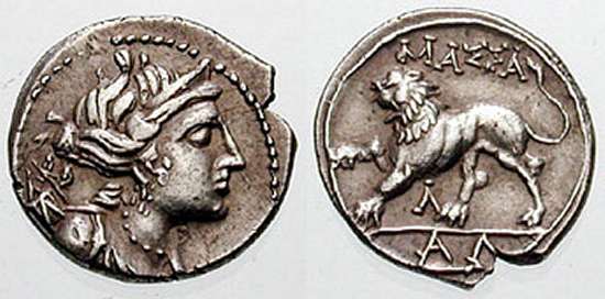 | Paris BN 867 | Massalia, Gaul, AR Drachm. 2.7 g., 15 mm. ca 220-200 BC. Bust of Artemis right, quiver over shoulder / MAΣΣA, Lion walking right; A below. Paris BN 867. | Text | Image |