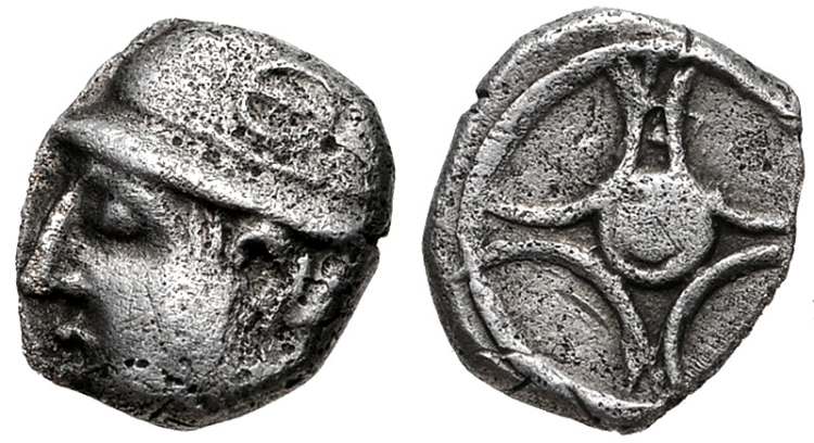 | DLT 524 | Massalia. AR obol, ca 450-410 BC. 9 mm, 0.7 g. Helmeted male head left, helmeted decorated with a wheel of four spokes. / Wheel of four spokes. DLT 524; Maurel 290. | Text | Image |