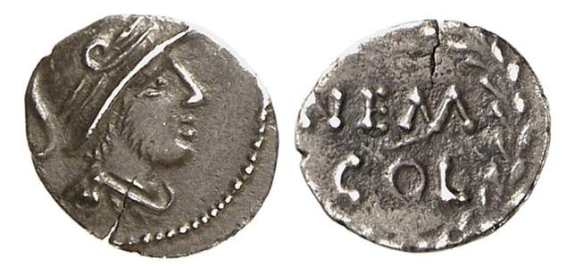 | RPC 519 | Nemausus (Nimes), AR obol, ca 40 BC. 0.38 g. Helmeted and draped bust of Mars (?) right / NEM-COL in two lines within laurel wreath. RPC 519; LaTour 2718. | Text | Image |