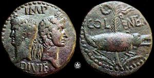 | RPC 524 | Augustus & Agrippa AE Dupondius or As of Gaul, Nemausus. ca 10 BC - 10 AD. IMP DIVI F, back-to-back heads of Agrippa, in rostral crown, & Augustus, in oak wreath / COL NEM, crocodile chained to palm behind, wreath to left. Cohen 10, RPC 524. | Text | Image |