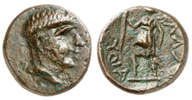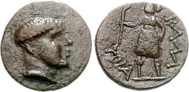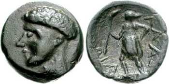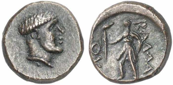 | BMC 8 | Ballaios, King of Pharos, Illyria. 190-168 BC. AE 13-14mm. Bare head of Ballaios left / (BAΣIΛEΩΣ BAΛΛAIOY) to left and right of Artemis, wearing short chiton, running left, holding torch and one spear. BMC 8; Mionnet II, 270. | Text | Image |