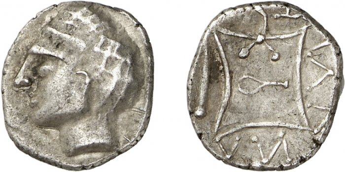 | Tkalec 2013, 19 | Damastion ?, Illyria, AR obol, 8 mm. Ca 395-380 BC. Laureate head of Apollo left / A-Σ, kantharos. Unpublished. Tkalec 2013, 19. | Text | Image |
