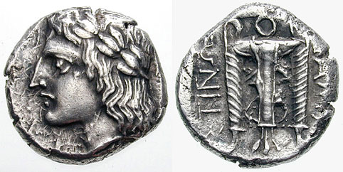 | May XI, 22 | Damastion, Illyria, AR drachm, ca. 350-330 BC. 2.16 g. Laureate head of Apollo right / ΔAM-AΣT-[IN] (partially retrograde), pick-axe used in mines. May p. 137 and pl. XI, 22 (same dies); cf BMC 16. | Text | Image |