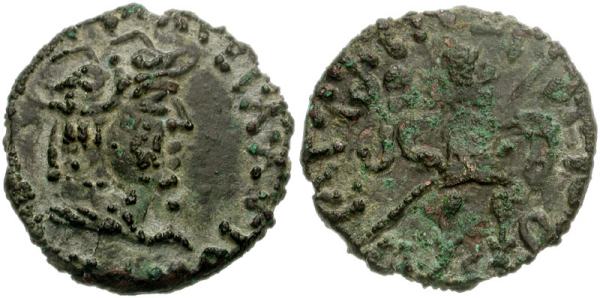 | MIG 1053d | Kushan Empire, Kujula Kadphises. Circa AD 30/50-80 AD. AE Dichalkon (17mm, 2.54 g). Chach region? Laureate head left / King standing left, with sword. | Text | Image |