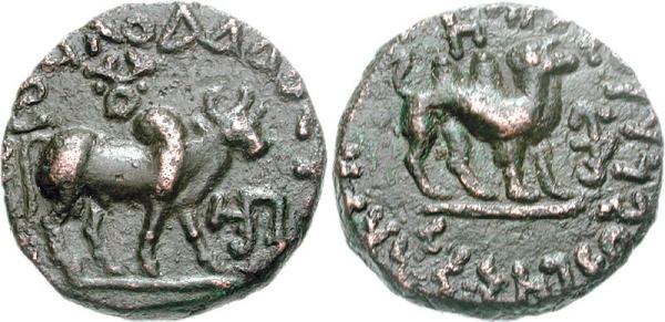 | Senior B11.2 | Kushan Empire. Kujula Kadphises. Circa AD 30/50-80. Æ 22mm (7.50 g, 6h). Bull standing right; nandipada above, Kharosthi Pu to right / Camel standing right, Kharosthi Dhra to right. Senior B11.2; Donum Burns 45 var. (letter on rev.). | Text | Image |