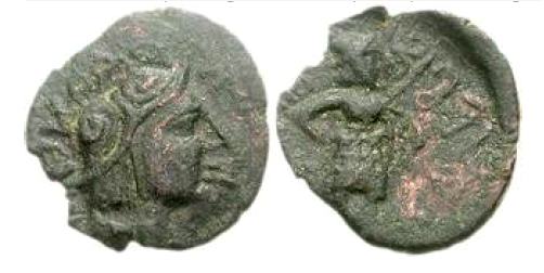 | MIG 1052 | Kushan Empire. Kujula Kadphises. Circa AD 30/50-80 AD. AE Tetradrachm (20mm, 5.10 g, 4h). Helmeted bust right / helmeted warrior to right, holding transverse spear; Kharosthi letters in fields. | Text | Image |