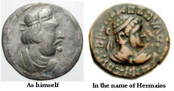| Whitehead 12 | Kujula Kadphises I and Hermaeos. 30-80 AD, AE Drachm, 20mm, 4.5 gr. legend with the name of Hermaeos, diademed and draped bust of Hermaios right / Karosthi legend, Herakles standing facing, head left, holding club and lionskin, no monograms. Whitehead 12; Calcutta 1; cf. BMC 1-8. | Text | Image |