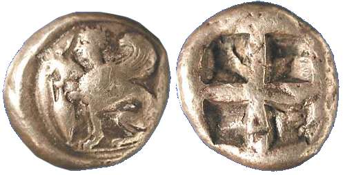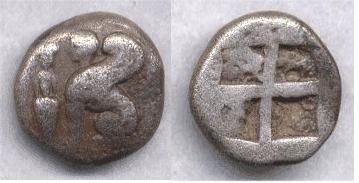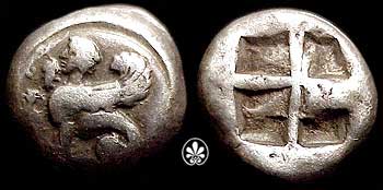 | SNGCop 1545 | Chios, Ionia. c. 478-431 BC. Silver Half Stater, 13mm (3.46 gm). sphinx sitting left, amphora to left / Quadripartite incuse square. | Text | Image |