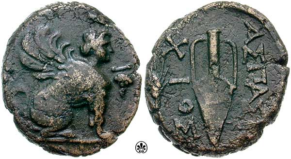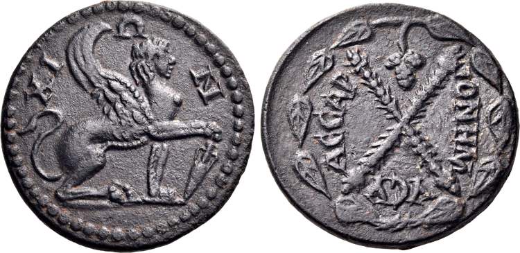 | BMC 128 | Chios, Ionia, AE24 3 Assaria, 150-268 AD. 7.35 gr. AΣAΡIA TΡIA, Sphinx sitting right, left front paw raised, prow below / EΠ AΡX XΡYΣOΓONOY TOY EΠ AΦΡOΔEITOY, Amphora between two grain ears. BMC 128; Paris 5137; Weber 6283. | Text | Image |