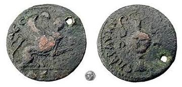 | BMC 114 | Chios, Ionia, AE Dichalkon. 14mm, 1.8g. 1-150 AD. XI-Ω-N, Sphinx sitting left, forepaw raised / ΔIXA-ΛKON, amphora with pointed lower end, dotted border. BMC Ionia 114; Mionnet 3, 114. | Text | Image |