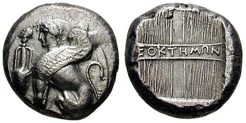 | CNG 61, 718 | Ionia, Islands off, Chios AR Tetradrachm. ca 412-350 BC. sphinx sitting left, amphora surmounted by grape-bunch before / Quadripartite incuse square, ΘEOKTHMΩN across horizontal band; vertical striations within each quarter. | Text | Image |