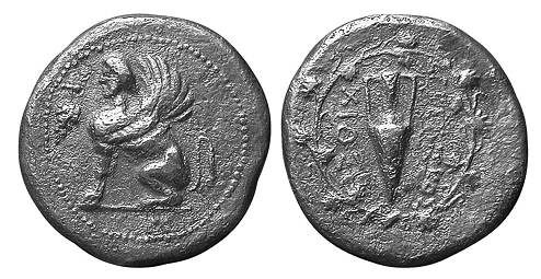 | BMC 54-55 | Chios, Ionia, AR Drachm 19 mm, 4 g. 133-84 BC. Magistrate Derkylos. Sphinx sitting left, bunch of grapes to left. / XIOΣ ΔEΡKYΛOΣ, amphora; cornucopiae in outer lef field. BMC 54-55; SNG von Aulock 2278-2279; SNG Post 252; SNG Cop 1562; de Luynes 2675-2676; SNG Lockett 2865; SNG Leipzig 1216; Dewing 2326-2329. | Text | Image |