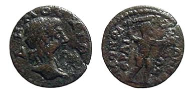 | SNG Cop 1645 | Chios, Ionia, Pseudo-autonomous issue. AE obol, ca 100 AD. 9.80 g. OBOΛOΣ, Sphinx sitting right, placing front paw on prow / XIΩN, naked hero standing facing holding staff or spear, helmet at foot left. SNG Cop. 1645; SNG von Aulock 2281. | Text | Image |