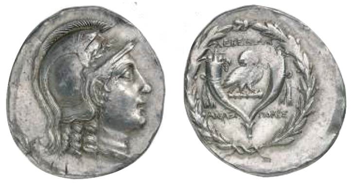 | Mionnet 582 | Lebedos, Ionia, Athenaios, magistrate AR tetradrachm. 160-140 BC. Head of Athena right, wearing crested Corinthian helmet / ΛEBEΔIΩN above, AΘH-NAIOΣ beneath owl standing right, head facing, on club between two crossed cornucopiae, all within wreath. Mionnet 582; KME 6-8; BMC 1 var (magistrate). | Text |  |