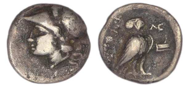 | wwxls AR9071 | Lebedos, Ionia, Civic issue, AR diobol, 330-300 BC. 11.4 mm, 1.5 g. Magistrate Ekatonymos. Helmeted head of Athena left. / ΛE EKATΩNYMOΣ above and to left of owl standing slightly right, head facing. Small prow in right field. Unpublished magistrate. wwxls AR9071; Bucephalus 21, 98. | Text |  |