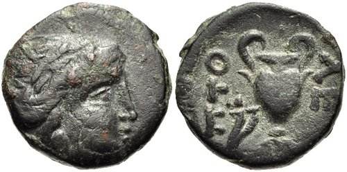 | BMC 11 | Lebedus, Ionia, AE19, 4.7 gr. 190-0 BC. Helmeted head of Athena facing / ΛE AΛKIMAXOΣ (?), Dionysos standing half-left, holding kantharos and thyrsos. SNG Cop 796; Lindgren III, 369; BMC 11. | Text |  |
