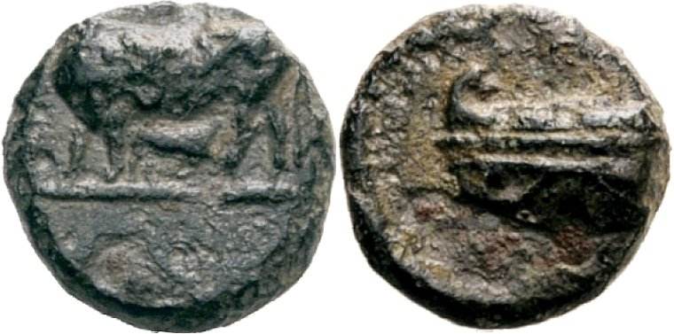 | Imhoof SNR 19, 108 | Lebedos, Ionia, AE. 350-300 BC. 1.34 g. Cow standing left with calf / ΛEBE, Prow left. Imhoof-Blumer in SNR 19, 108. | Text |  |