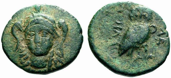 | Imhoof KM 8 | Ionia, Lebedos, AE18, Head of Athena / Owl right, 200-100 BC. Facing head of Athena, wearing triple-crested Attic helmet / ΛE KONNIΩN downwards to right and left of owl standing right, head facing. Imhoof KM 8. | Text |  |