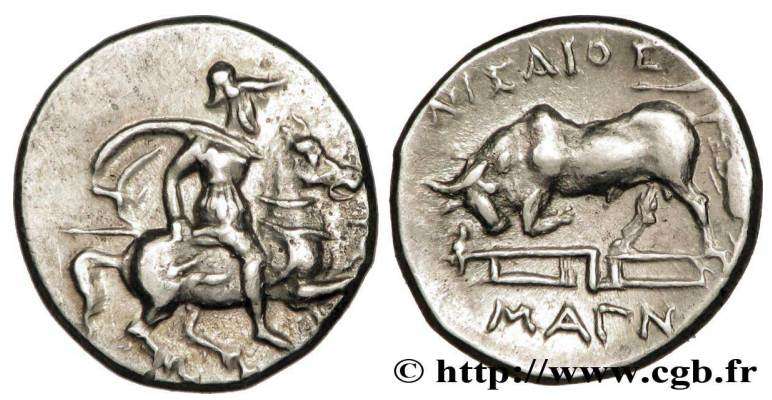 | wwxls AR12262 | Magnesia ad Maeandrum. Ionia. AR didrachm, ca 350-300 BC. 5.26 g. Magistrates Nisaios and Zenos. Rider, holding couched lance, on horseback prancing right. / MAΓN NIΣAIOΣ ZHNΩ, bull butting left; corn-ear in right field, all within circular maeander pattern. Unpublished with these two magistrates' names. wwxls AR12262. CNG 26, 62152. | Text | Image |