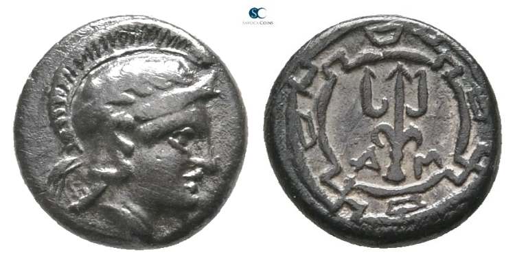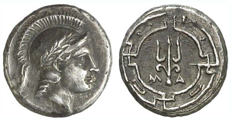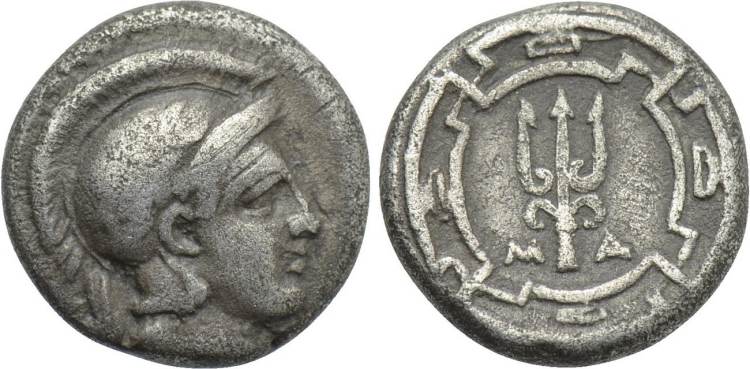 | BMC 15-16 | Magnesia ad Meandrum, Ionia. AR Obol, 0.67g; 9mm, 350-190 BC. Head of Athena right wearing crested Athenian helmet, bound with olive wreath / M-A, to left and right of ornate trident head within circular Meander pattern. SNG von Aulock 2032; BMC 15-16; SNG Fitz. 4511; SNG Cop 810; SNG Berry 1066; SNG Tuebingen 2923; SNG Post 215. | Text | Image |