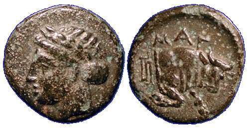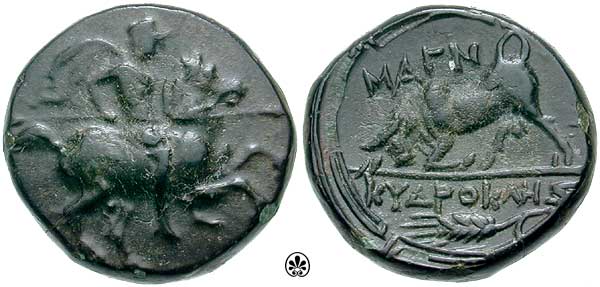 | SNG Cop 814 | Magnesia ad Maeandrum, Magnesia. 350-190 BC. AE15. Horseman riding right / MAΓN KYΔΡOKΛHΣ above and beneath bull butting left; grain ear below. | Text | Image | Text | Image |
