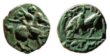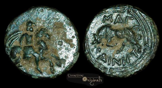 | BMC 19 | Magnesia ad Maeandrum, Ionia. AE 8mm, 0.5 gr. 350-250 BC. Male figure on horseback right with couched lance / MAΓN BATM, bull butting left. SNG Copenhagen 841; BMC 19ff. | Text | Image |