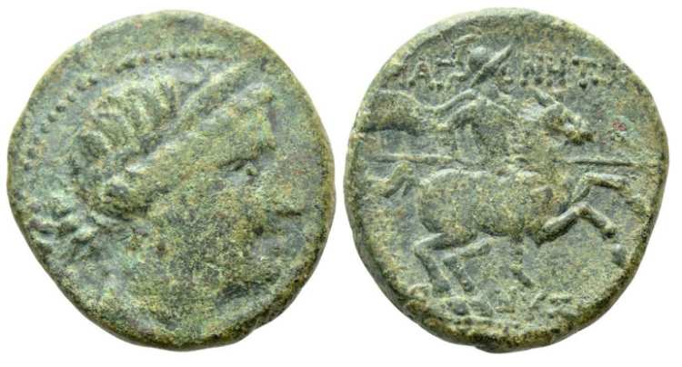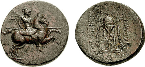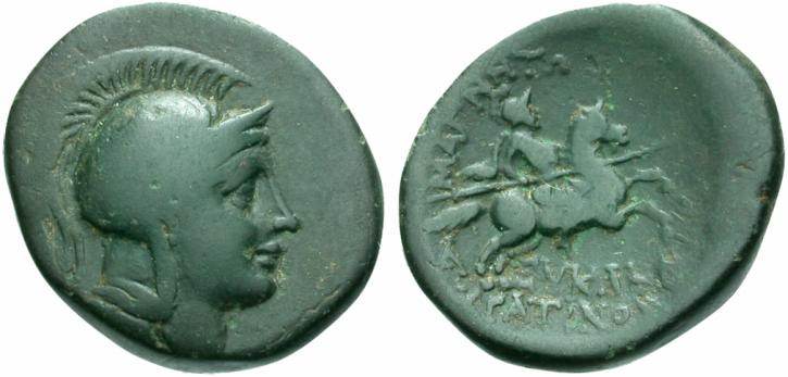 | SNG Cop 850 | Magnesia ad Maeandrum, Ionia. After 190 BC. AE 20mm. Helmeted head of Athena right / MAΓNH EYKΛHΣ KΡATINOΣ, Rider with lance on horseback galloping right; magistrates . BMC 44, SNG von Aulock 2043. | Text | Image |