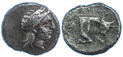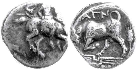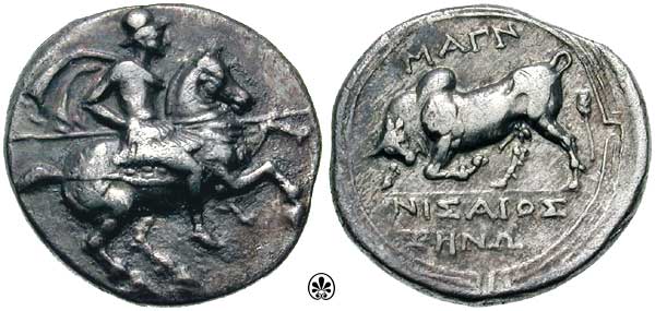 | BMC 9 | Magnesia, Ionia. AR diobol, (1.62g) c. 350 BC. Armed horseman prancing right, holding couched spear. / NIΣAIOΣ above, MAΓN below, Humped bull butting left. BMC 9; SNG von Aulock 2036, this coin. Type Sear Greece 4480. | Text | Image |