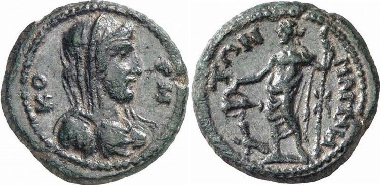 | Imhoof KM 26 | Sabina AE15 of Magnesia, Ionia. (from top right) CABEINA CEBACTH, draped bust right / KOΡH MAΓNHTΩN, Kore standing left, holding grain ears. Imhoof KM 26. | Text | Image |