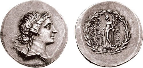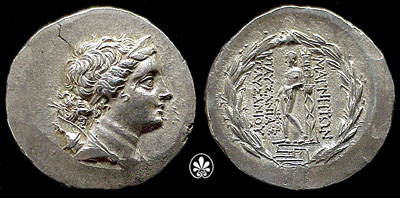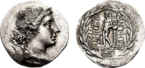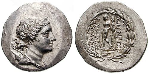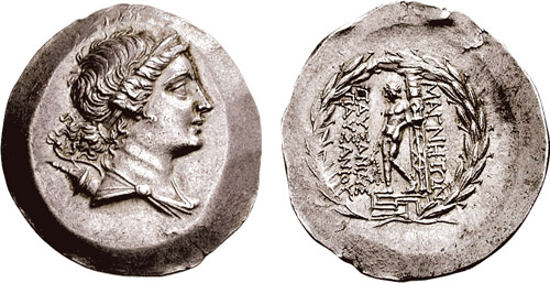 | Jones 8 | Magnesia ad Maeandrum, Ionia. ca 160-150 BC. AR Tetradrachm. Magistrate Pausanias, son of Pausanios. Bust of Artemis right, quiver over shoulder / MAΓNHTΩN ΠAYΣANIAΣ ΠAYΣANIOY, Nude Apollo standing left, left elbow resting on tall tripod behind, holding branch tied with fillet in his right hand. SNG Cop 844; Mionnet VI, 1007; SNG von Aulock 7922; Jameson 1504; SNG Lockett 2830. | Text | Image |
