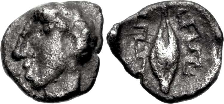 | SNG Turkey 395, right | Magnesia ad Maeandrum, Ionia, 5th c. BC. AR Tetartemorion 5 mm, 0.17 gr. Laureate head of Apollo right / MAΓ to left of barley corn, section of maeander pattern to right. cf. SNG Turkey I, 395-396. | Text | Image |