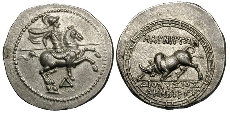 | Kraay 15 | Magnesia ad Maeandrum AR Octobol. ca 155-145 BC. Magistrate Dionysos, son of Demetrios. Helmeted, cuirassed warrior on horse rearing right, holding couched spear, Δ below / MAΓNHTΩN, ΔIONYΣIOΣ ΔHMHTΡIOY, bull butting left, all within meander border. Prowe III 949; Bement Coll. 1458 (both: this coin); Kray-Moerkholm 15; rev legend var of SNG Cop 825 and Rhousopoulos 3718 (both with MAΓNHT only). | Text | Image |