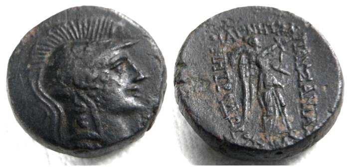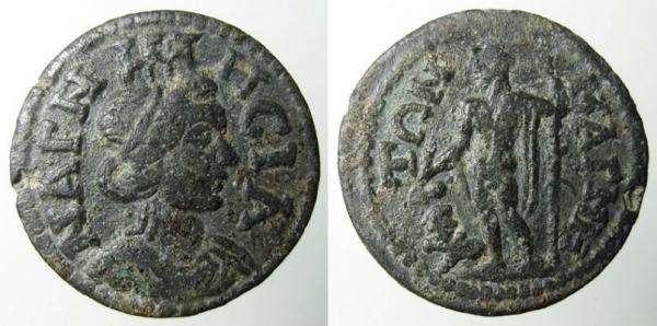 | Schultz 102A | Antoninus Pius, AE35 of Magnesia ad Maeandrum, Ionia. AD 139-144. Magistrate Diophantos. 23.94 g. AY KAICAΡ AΔΡIA ANTΩNEINOC CE, laureate, draped and cuirassed bust right. / ΓΡAM ΔIOΦANTOY MAΓNHTΩN, helmeted warrior standing front, holding spear and shield, looking right, fallen enemy at his feet. Schultz 102A; Pudill Coll sale 591; RPC 1021. | Text | Image |