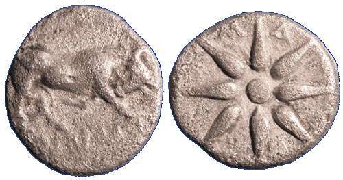 | Mueller 2137 | Magnesia ad Maeandrum, Ionia, AR Tritartemorion 7 mm, 0.29 gr. Bull butting right, maeander pattern below / MAΓNHTΩN between the rays of a star with eight rays and dot in centre. cf. SNG Turkey I, 397; Mueller Collection 2137. | Text | Image |