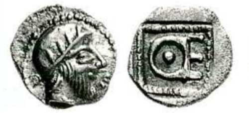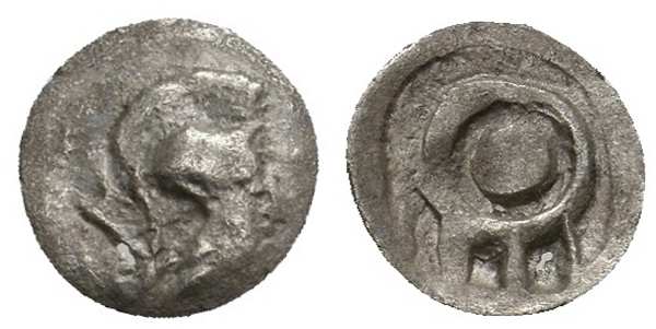 | Sheedy 13 | Magnesia Ad Maeandrum, Ionia, AR 7 mm hemiobol, struck under Themistokles, 465-459 BC. 0.14 g. Helmeted, bearded head of Leukippos right. / ΘE monogram in incuse. Sheedy 13; Nollé & Wenninger Th 5b; Cahn-Gerin 6. | Text | Image |