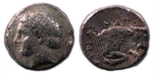 | Mueller 2071 | Magnesia ad Maeandrum, Ionia, AR Tetartemorion, 7 mm, 0.20 gr., 5th c. BC. M behind head of Apollo right with curled hair / MAΓNH above humped bull butting right, maeander pattern below. Mueller Coll. 2071. Unpublished. | Text | Image |