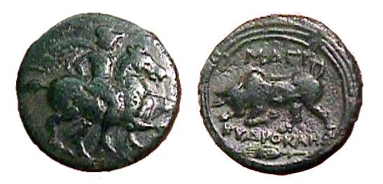| SNG Tub 2932 | Magnesia ad Maeandrum, Ionia, AE. 350-190 BC. Magistrate Klearchos. Horseman riding right, holding spear / MAΓN KΛEAΡXOΣ above and beneath zebu bull butting left, within maeander pattern. Grain ear in field. SNG Tuebingen 2932. | Text | Image |