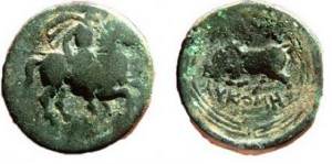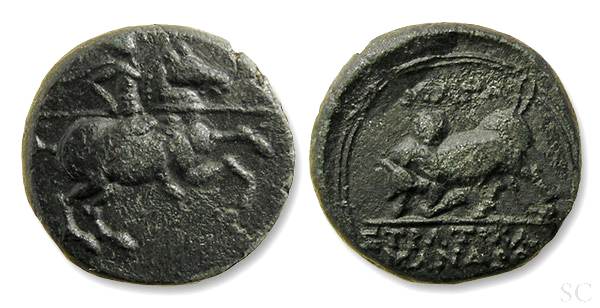 | SNG Cop 840var | Magnesia, Ionia, AE 16mm; 4.3g. 350-190 BC. Hippokrates magistrate. Horseman riding right, holding couched lance in left hand / MAΓN, HΓΡ-EΠH HIΠΠOK-ΡATOY in two lines below, humped bull butting left. SNG Copenhagen 840 var. (name written as IΠΠOKΡATHΣ KTEA). | Text | Image |