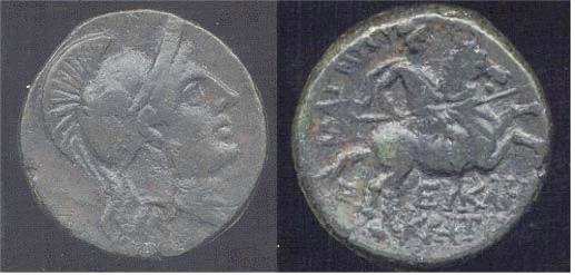 | BMC 44 (2) | Magnesia ad Maeandrum, Ionia. After 190 BC. AE 19mm. Head of Athena right, in crested Attic helmet decorated with a wing / MAΓNHTΩN EYKΛHΣ KΡATINOΣ, warrior, holding spear pointed forwards and with chlamys flying behind, on horseback prancing right;Σ to left. SNG Cop 849, BMC 44, SNGvA 2043. | Text | Image |