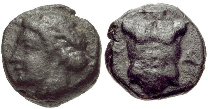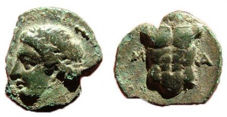 | SNG Kayhan 393 | Magnesia ad Maeandrum, Ionia. Ca 400 BC. AE7mm. 0.85 g. Laureate head of Apollo left / M-A, Cuirass, resembling human torso. SNG Kayhan 393. | Text Text | Image Image |