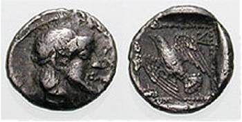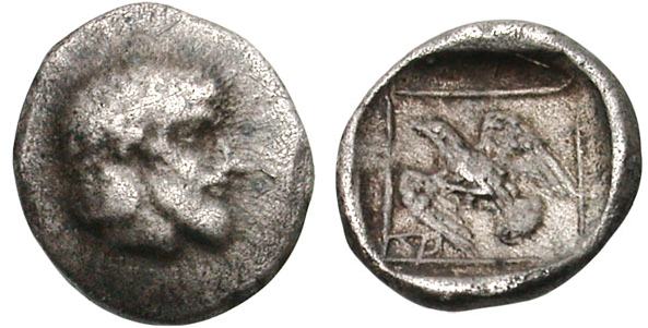 | SNG Tub 2922 | Ionia, Magnesia ad Maeandrum, Themistokles AR Tetartemorion. ca 465–460/50 BC. Bearded male head right (Themistokles?), in wreath or taenia / Eagle flying left, AP monogram(?) below, all in incuse square with linear border. Cahn and Mannsperger 1–2. | Text | Image |