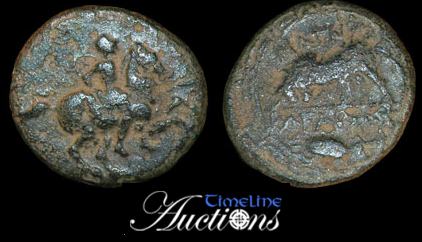 | SNG Fitz 4512 | Magnesia ad Maeandrum, Ionia, AE unit. 350-190 BC. Magistrate Kleandros. 19.06mm, 5.71 gr. Helmeted horseman prancing right, holding couched spear / MAΓN KΛEANΔΡOΣ above and beneath bull butting left, within meander border, corn-ear below. SNG Fitzwilliam 4512; Leake 3; Sear Greece 4487-4488 var (magistrate, corn-ear). | Text | Image |