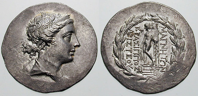 | SNG vA 2042 | Magnesia ad Maeandrum, Ionia AR Tetradrachm. ca 160-150 BC. Magistrate Erasippos, son of Aristeos. Diademed bust of Artemis right, quiver over shoulder / MAΓNHTΩN EΡAΣIΠΠOΣ AΡIΣTEOY, nude Apollo standing left, left elbow resting on tall tripod behind, holding branch tied with fillet in his right hand; maeander pattern below; all enclosed in a laurel wreath. Jones 32a; SNG von Aulock 2042; Hunter 7; BMC 37; de Luynes 2619; Pozzi 2461; SNG Berry 1067. | Text | Image | Text | Image |