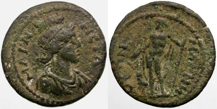 | SNG Dusseldorf 11369 | Julia Domna, AE19 of Magnesia ad Maeandrum, Ionia. AD 193-217. IOY ΔOMNA CE, draped bust right. / MAΓNHTΩN, Apollo standing left, holding branch and resting left arm on column. SNG Düsseldorf 11369. Not in Schultz. | Text | Image |