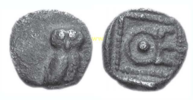 | Sheedy Th15 | Themistokles, AR tetartemorion. Magnesia ad Maeandrum, Ionia. 0.17 g. 524–459 BC. Owl standing right, head facing, wings closed. / ΘE monogram in a square border of dots, all within incuse. Sheedy Th15-16 in NC 1971; Nolle & Wenninger Th6a. | Text | Image |