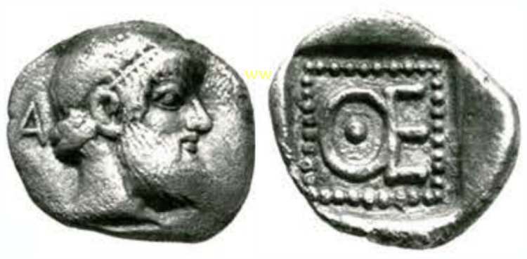 | Sheedy Th5 | Themistokles, AR trihemiobol. Magnesia ad Maeandrum, Ionia. 0.96 g. 524–459 BC. A-(M) behind bearded head of Zeus or Themistokles right, hair bound in a taenia. / ΘE monogram in a square border of dots, all within incuse. Sheedy Th5 in NC 1971; Cahn-Mannsperger pl. 44, 3; Nolle & Wenninger Th3a. | Text | Image |